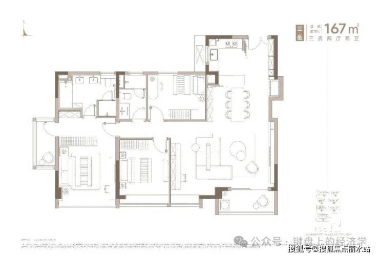 167平全小区就没有几套,所以做成了大横厅+大三房,目标非常明确,就是依靠宽敞的空间,来吸引那些家庭人口较少,愿意为舒适度买单的富豪,比如年轻富二代,中航金城1号业主的父母等等。