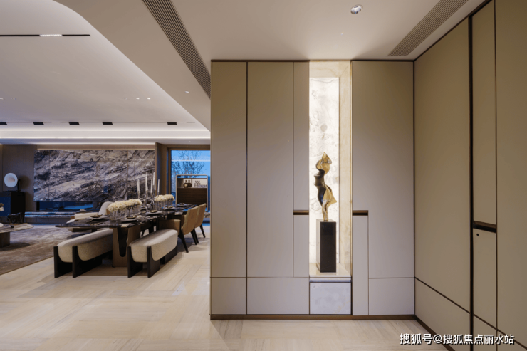 在明湖之心·星洲,石材的运用也有着创新手法,通过斜切、弧面等高级工艺,不仅视觉上进一步提升,更延展出空间细节——