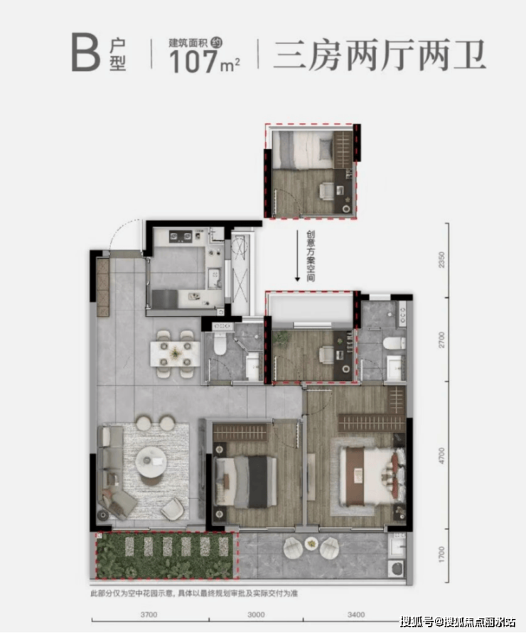 不过,得益于云创未来社区的属性优势,项目建面约107㎡产品拥有不少的面积赠送,该户型南向面宽超10米,主卧套房可以配置步入式衣帽间,同时三联阳台设计能轻松满足观景、洗衣晾晒的功能分区,具备远超普通89㎡户型的改善属性。