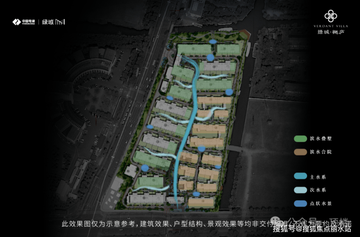绿城·樾庐外部打造约500米长水岸绿带「玉带湾」,呈现可漫步、可停驻、可社交的诗意栖居场域。内部以一条水轴「樾溪川」构筑当代园林系统,并划分两大业态组团,同时以支脉水系分割,形成岛屿化组团,在水境空间中勾勒流动的静谧体验。