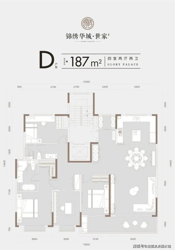 再来看最大的187平米四室两厅两卫户型,南向面宽高达约15米,可尽揽阳光入室,真正做到了尺度为王。约5米的南向客厅,为家庭成员提供了更大更舒适的相处空间,而双南向卧室的设计,又给了业主更多的独立思考空间。