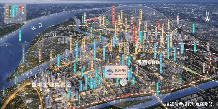 奥体中心、江苏大剧院、南京眼等城市地标汇聚,未来还将引进银行、证券、保险金融机构省级总部等作为新型地标,多栋摩天大楼集群衬托,成为新南京面向世界的封面。