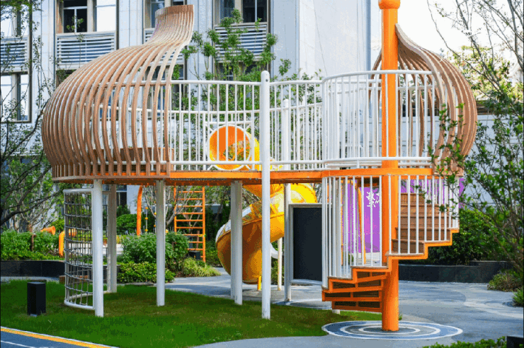 小区内绿植茂密,儿童游乐区色调明亮,设施丰富。旋转滑梯、攀爬架、健身组器材,小朋友们“释放电量”的好出去。