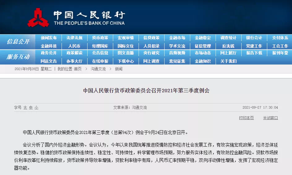9月27日傍晚,央行发布了“货币政策委员会2021年第三季度例会”的新闻通稿。