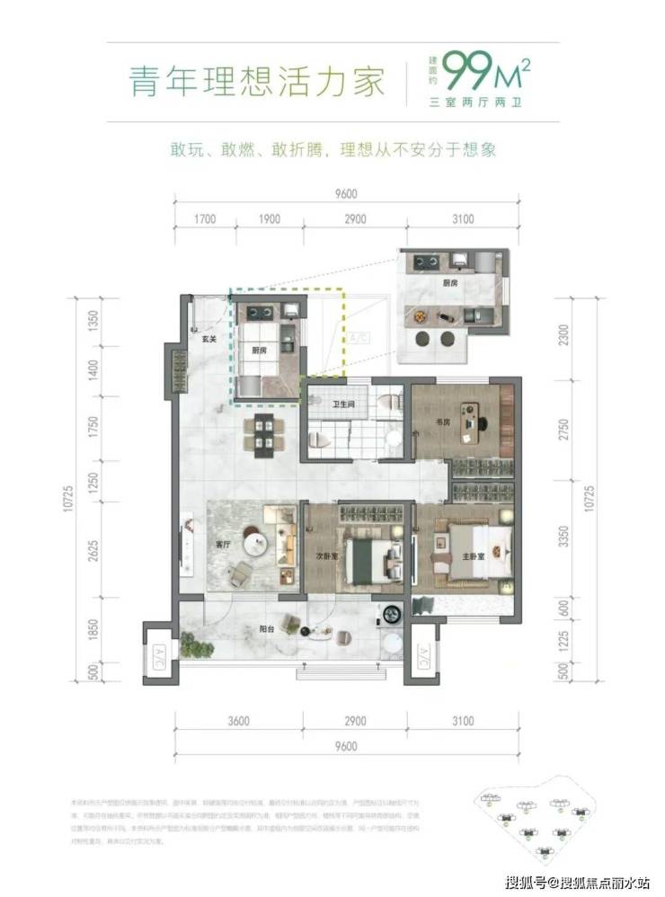 建面约99㎡户型突破产品力上限,重新定义了百平下的套三户型。户型方正通透全明三开间设计!客厅可拓展约6.5m大横厅,加上进深2.3的南向跑道双阳台,再加上约16㎡的赠送面积,在百平之下就能实现三世同堂的宜居场景。当然对于购房者来说,最大的好处就是在面积可控的前提下,总价更可控。