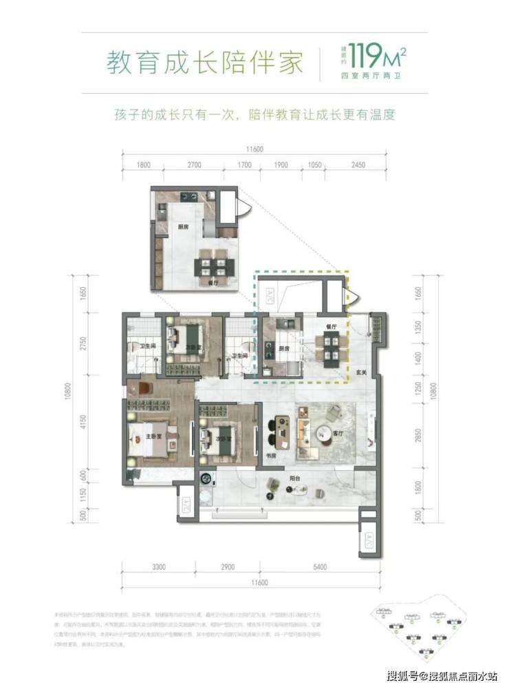 通和悦章建面约119㎡户型也是项目热度最高的户型,整体户型赠送面积约19㎡,放眼整个青岛市场,可与之对标的同类产品也不多见。独立餐厅+开间约5.4米的客厅+2.3米进深跑道式大阳台,不仅保证了全屋阳光的充足,更是提高了整体空间的舒适度;宽庭书房设计,功能性十足,二胎家庭、三代同堂都适宜。