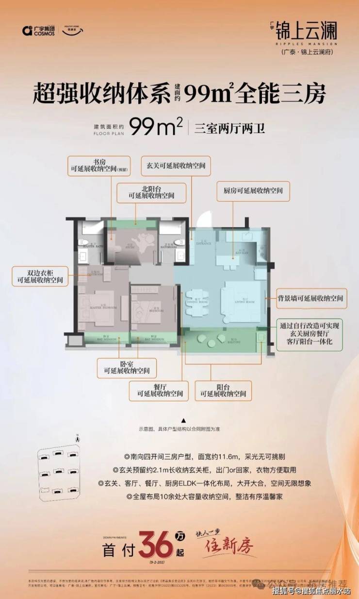 尤其是建面约99㎡的三房户型,南向约11.6米的大面宽,四开间朝南,空间尺度上有着感堪比市面上120方的阔绰感。