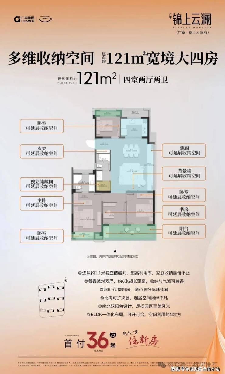 三代同堂的家庭,还可以选择建面约121㎡的大四房,超6㎡的U型厨房,朝南双阳台设计,拥有IMAX视野,更多高利用的储藏空间,让幸福家庭充满更多想象。