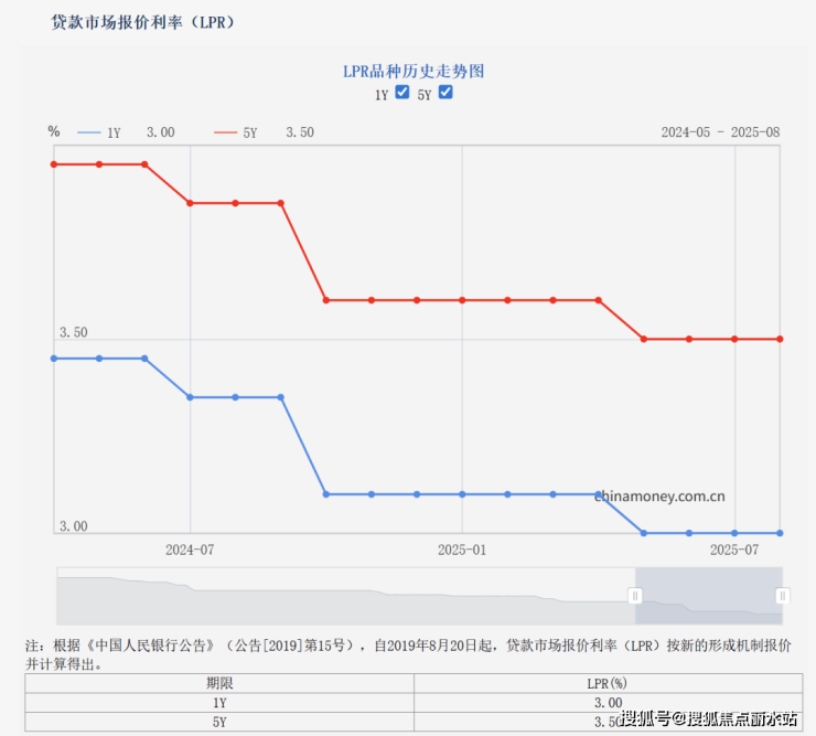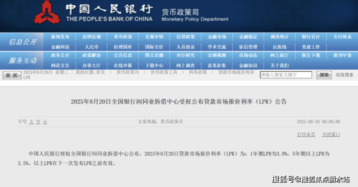 8月20日,中国人民银行授权全国银行间同业拆借中心公布,2025年8月20日贷款市场报价利率(LPR)为:1年期LPR为3.0%,5年期以上LPR为3.5%。以上LPR在下一次发布LPR之前有效。