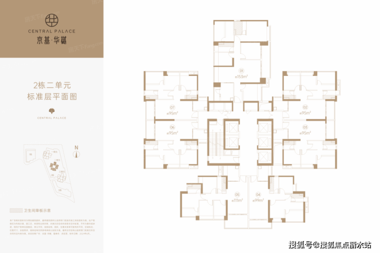 项目户型包括95㎡的3房2厅2卫、99㎡的3房2厅2卫、111㎡的3房2厅2卫、120㎡的3房2厅2卫、143㎡的4房2厅2卫及153㎡的5房2厅2卫,143㎡四房为横厅设计。