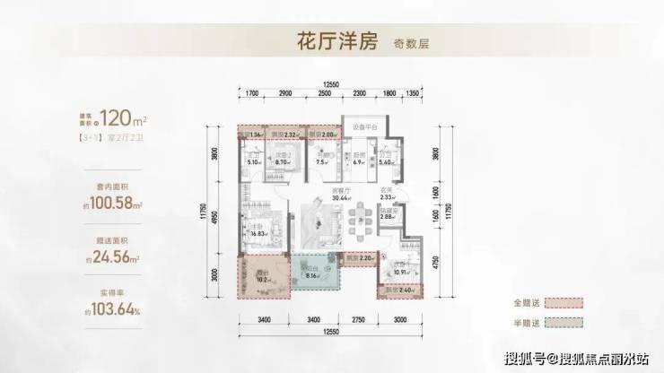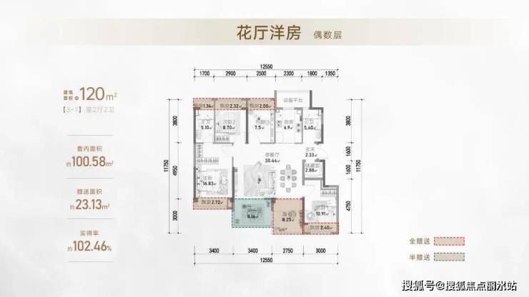 约6.3米挑空露台+5个飘窗+四开间朝南,而且,整个赠送的面积超过超24㎡,实得率超103%。