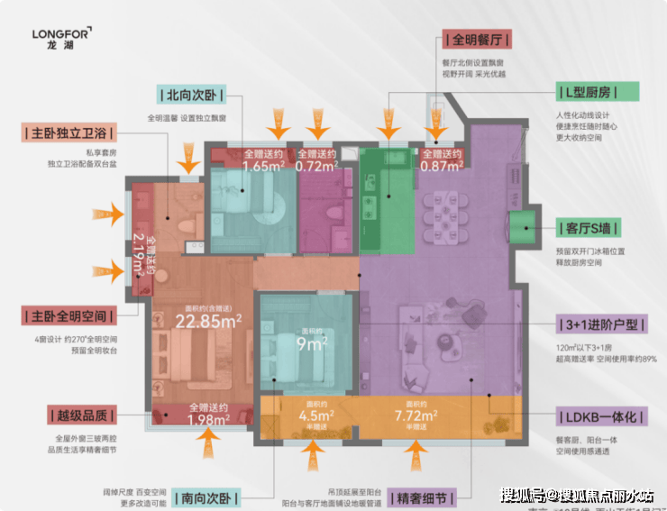 以89㎡的户型为例,功能性已达极致。市场罕见双卫设计,赠送面积挤出一间卫生间。客厅S墙嵌入冰箱、LDKG一体化空间、三玻两腔窗,处处体现“毫米级抠面积”的智慧,使用率约86%。