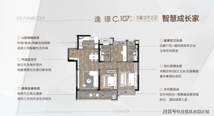简单看一下建面约107㎡户型图,除了三房两厅两卫的经典布局,户型方正、超大面宽、动静分离,这些特点都让它显得性价比满满。
