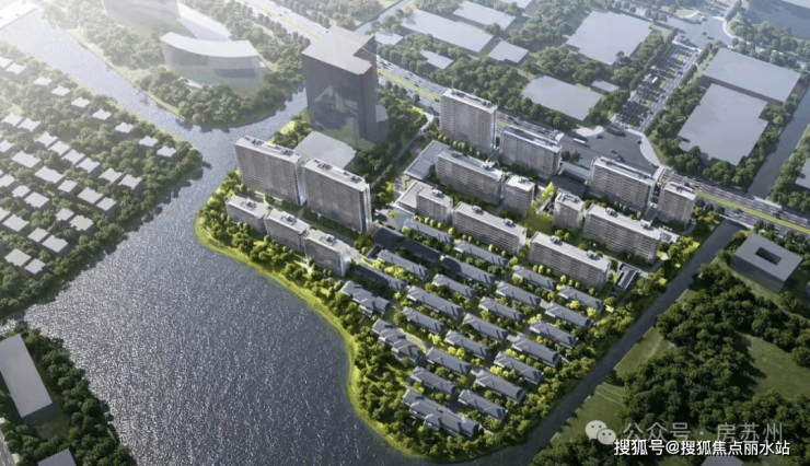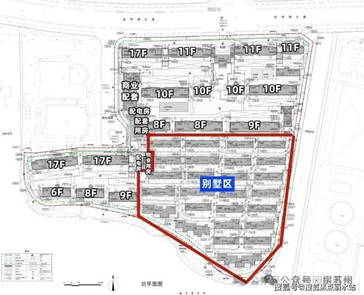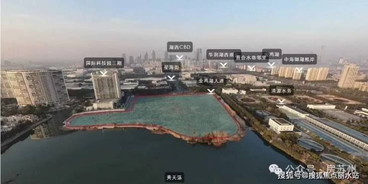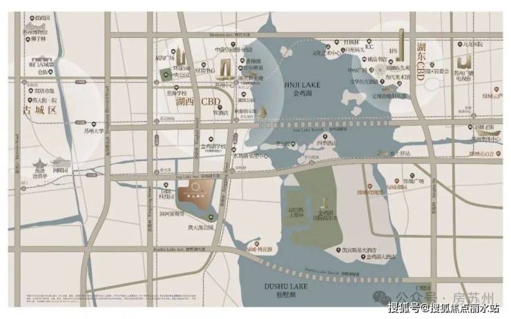 地块北侧紧邻金鸡湖大道,近地铁3/5/7号线,3站即达苏州中心;三面临水,水域连通金鸡湖、独墅湖,居住环境静谧。