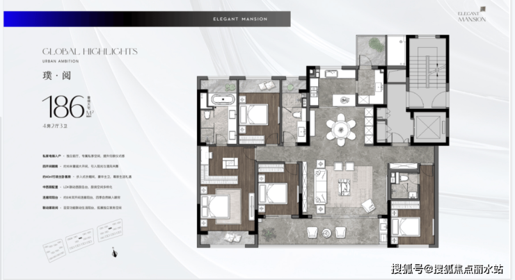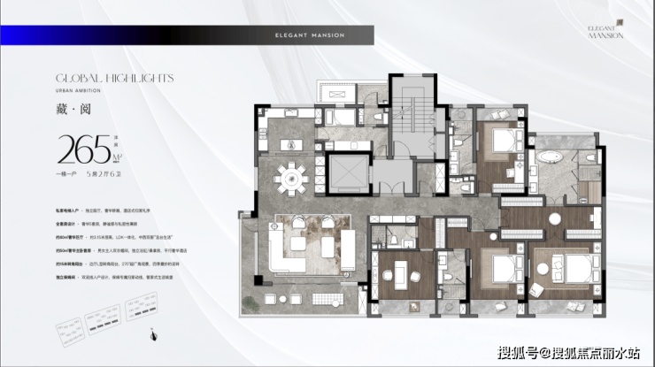 265:1梯1户,私家电梯入户,大宅的风范私藏了恢弘的气度。270°转角环幕巨厅,5套房设计,全景式演绎太湖新城一景一色。