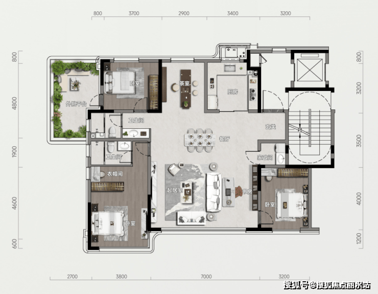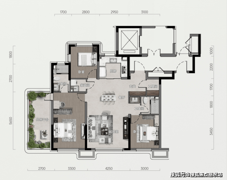 建面约103㎡高层户型同样亮眼。这款产品在三室两厅两卫基础上,额外增配了独立家政间、独立工具间以及约14㎡侧向空中花园,直接将以往在170㎡+洋房户型才出现的侧向空中花园搬进家。
