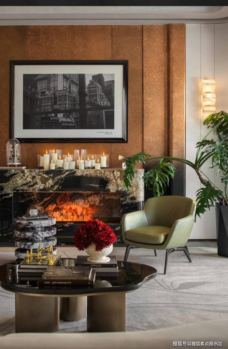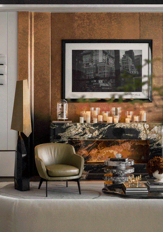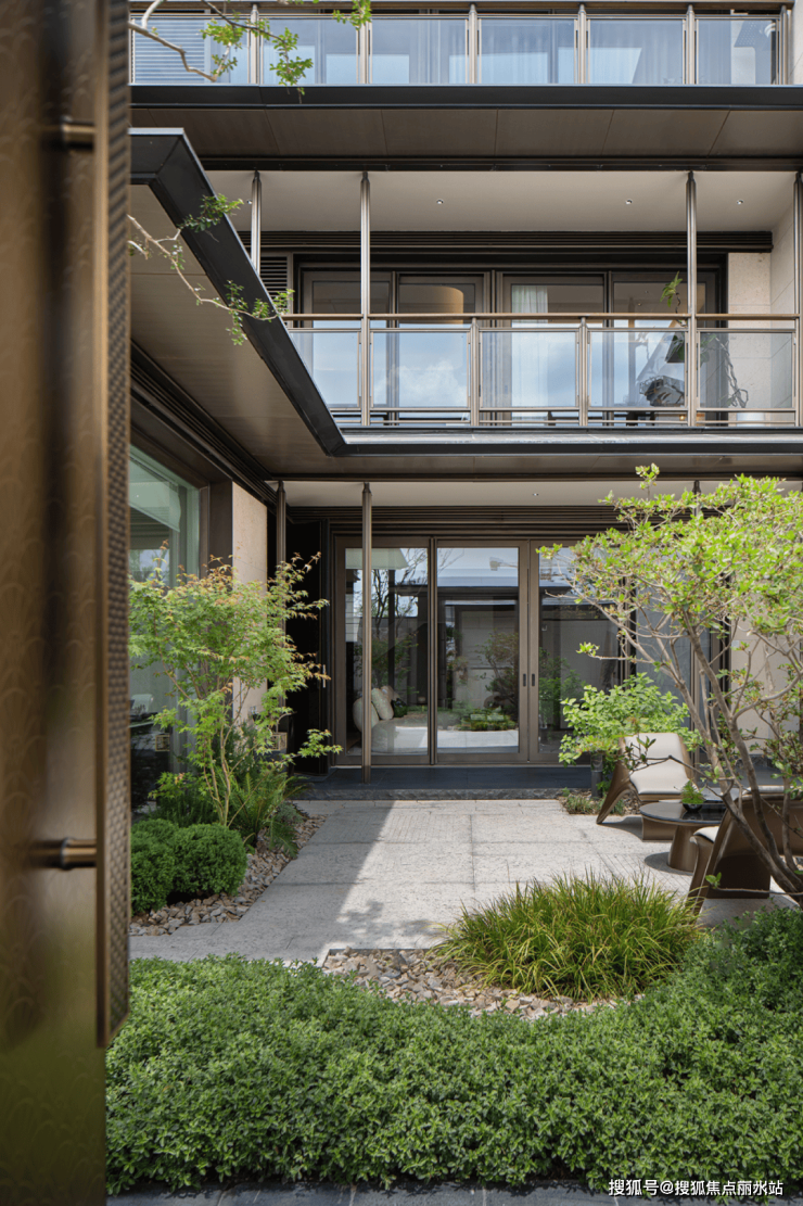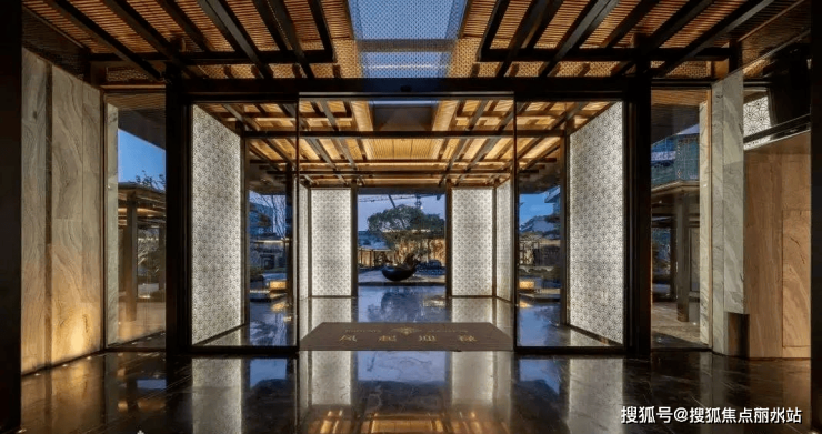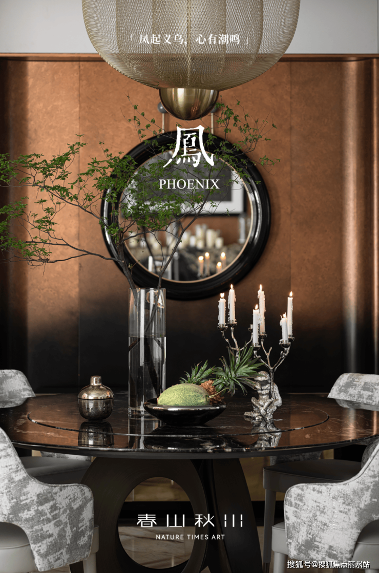 一道中式的厚重大门,将喧嚣与静谧相隔。提取极具象征意义的凤䎏雕刻其间,宛若有凤来仪,门内庭院借鉴天井式设计,再现环境与人文“天人合一”之境。园内绿植与石块刚柔并济,客厅与庭院相接,内外相通,大量金属与石材,令温润与冷峻巧妙融合。