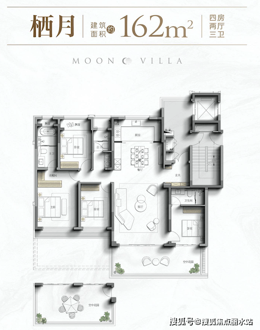 洋房产品:四代宅户型162/164㎡。偶数层:庭院衔接主卧次卧→私密花园;奇数层:庭院连通客厅→社交花园