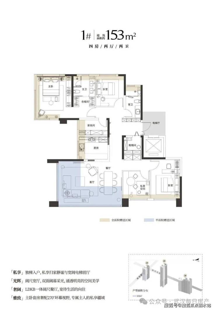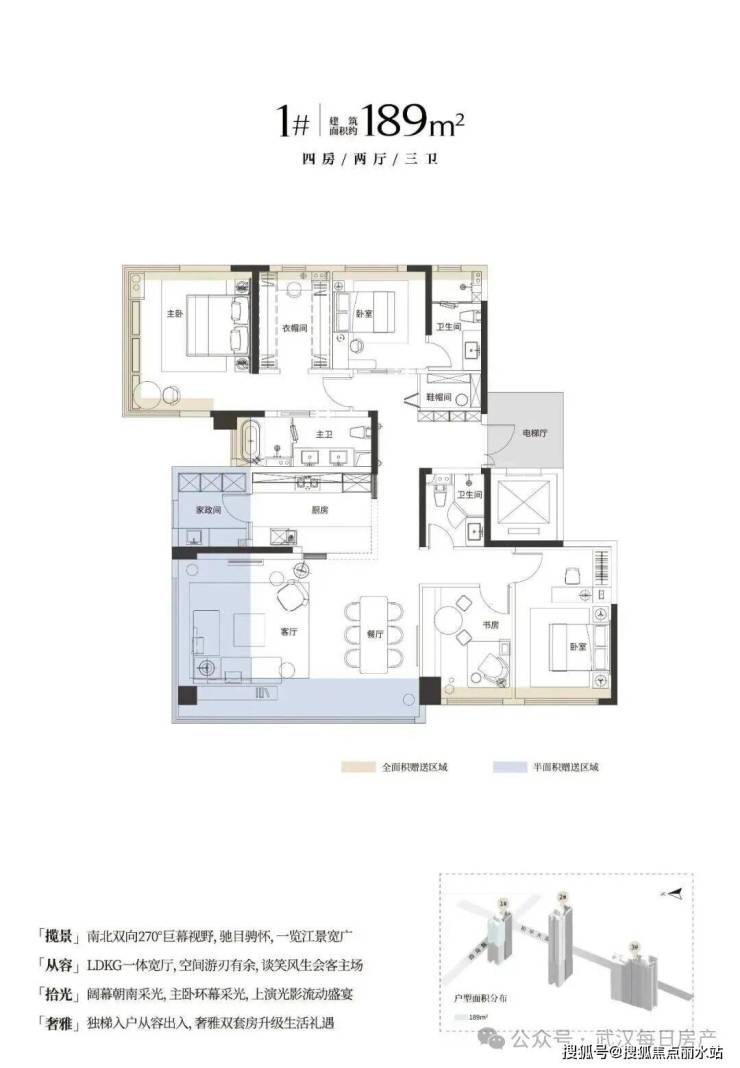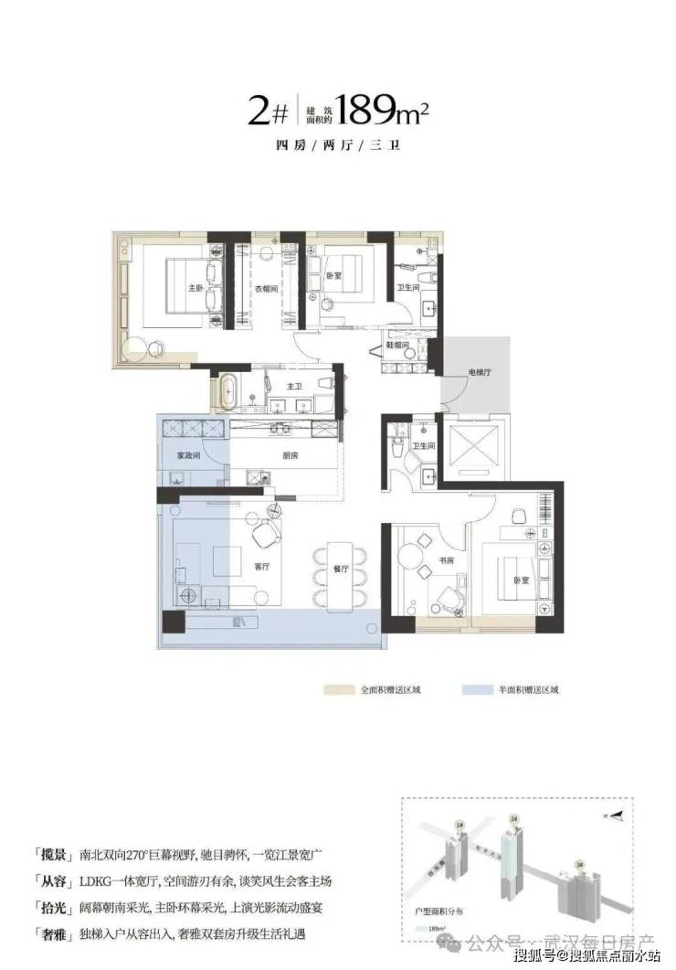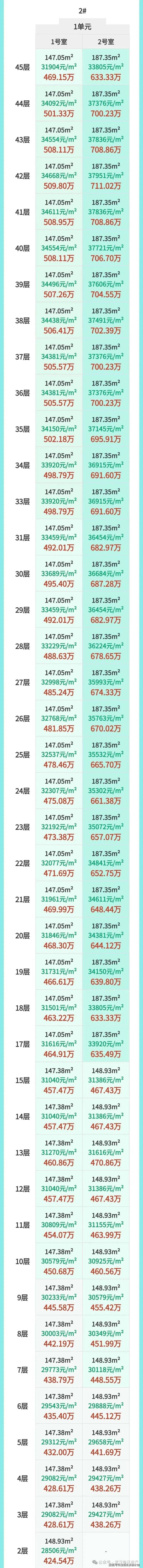 项目一共3栋楼,1号楼28F,2号楼45F,3号楼两个单元,一个28F,一个32F。项目户型为146/153/188㎡。
