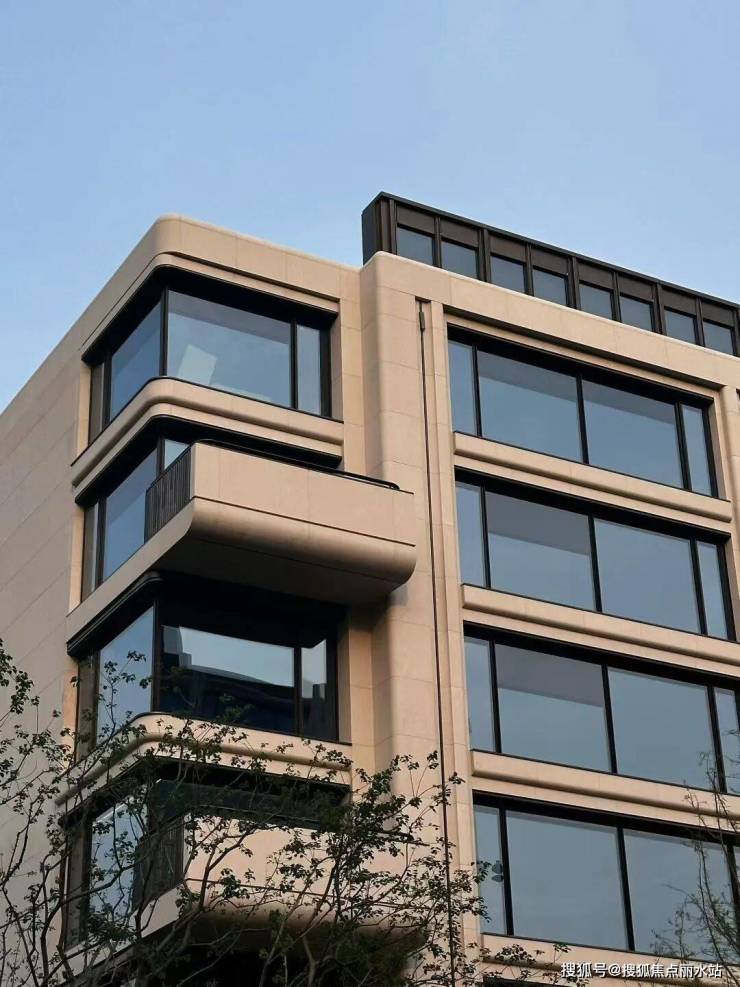 外立面采用葡萄牙米黄暖色石材、温和的手工艺术陶瓷砖,搭配仿铜色铝板线条与整面玻璃打造,优雅现代的高级质感,是绝对的视觉享受