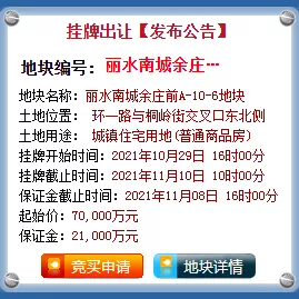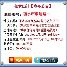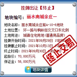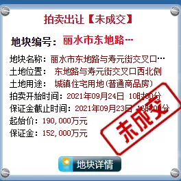 6月2日,丽水市联城路与联花路交叉口西北侧地块溢价率高达91.3%却惨遭流拍;8月2日,莲都采桑社区未成功出让;9月24日,丽水市东地路与寿元街交叉口西北侧地块竞价22轮最终无人认领;10月13日,丽水市丽水南城余庄前A-10-6地块在挂牌第二天被宣布终止。其中,丽水市东地路与寿元街交叉口西北侧地块&丽水市东地路与寿元街交叉口西北侧地块,在大幅度降低保证金后,再次挂牌。