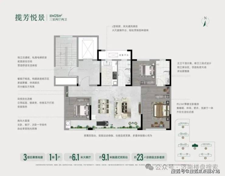 【126㎡三室两厅两卫】:分布在6号楼。一梯一户,约6.1米大横厅,约9.1米跑道式双阳台,3面落地窗,约23㎡总统级主卧套房。