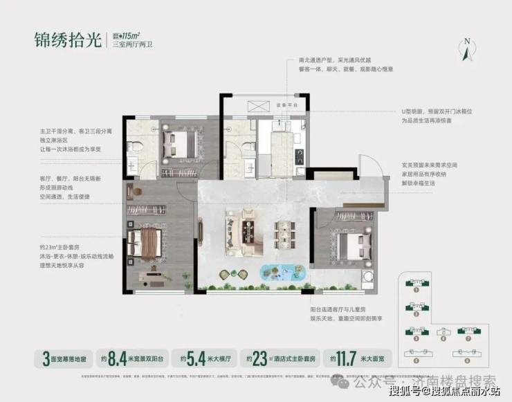 【115㎡三室两厅两卫】:分布在1/2/3/7号楼的边户。约11.7米大面宽,约8.4米宽景双阳台,约5.4米大横厅,3面落地窗,约23㎡主卧套房。