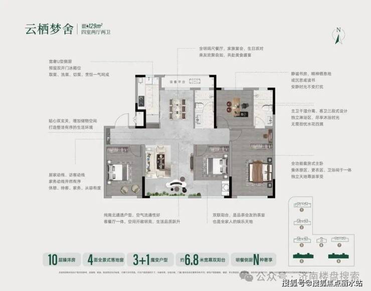 【129㎡四室两厅两卫】:分布在5/8号楼。10层洋房,3+1式灵活户型,4面全景落地窗,约6.8米宽幕双阳台。