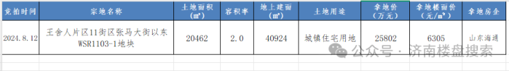 2024年8月12日,东营海通以2.58亿元的总价摘得张马WSR1103-1地块,楼面价6305元/㎡。
