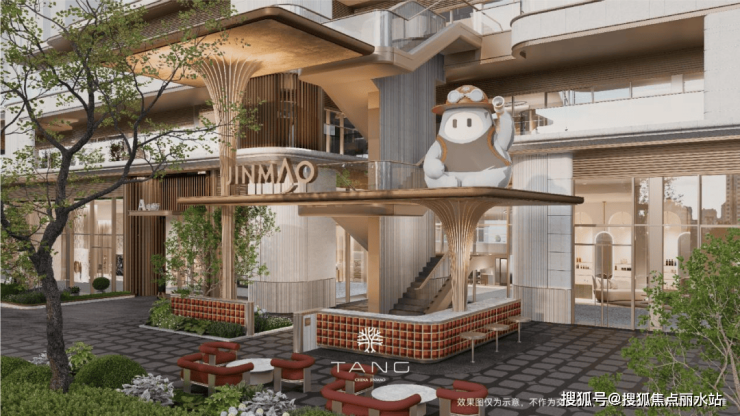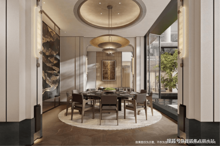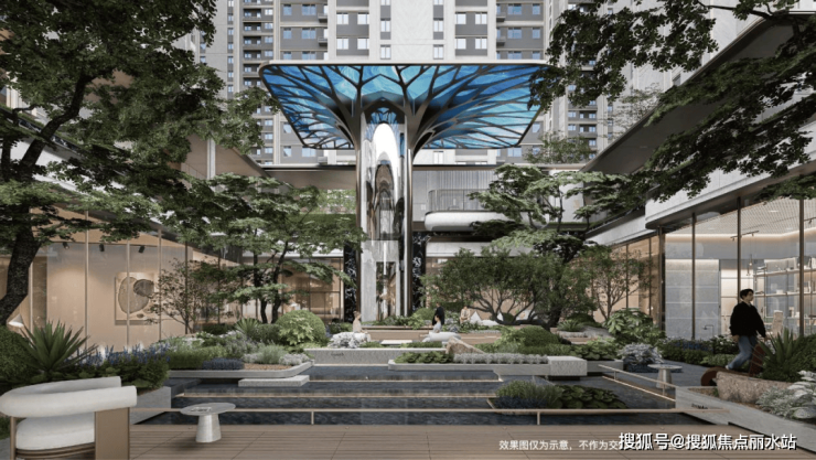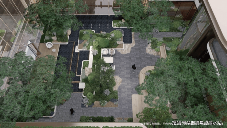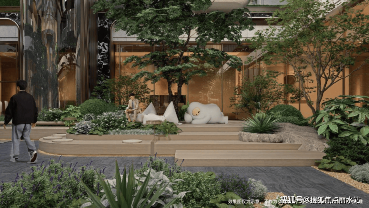 下沉庭院的设计尤为惊艳,水景选用黑金沙仿石材料,营造出阳光下波光粼粼、夜晚如繁星闪烁的静谧浪漫氛围,庭院四周种植四棵元宝枫,寓意守护居民财富和运气。