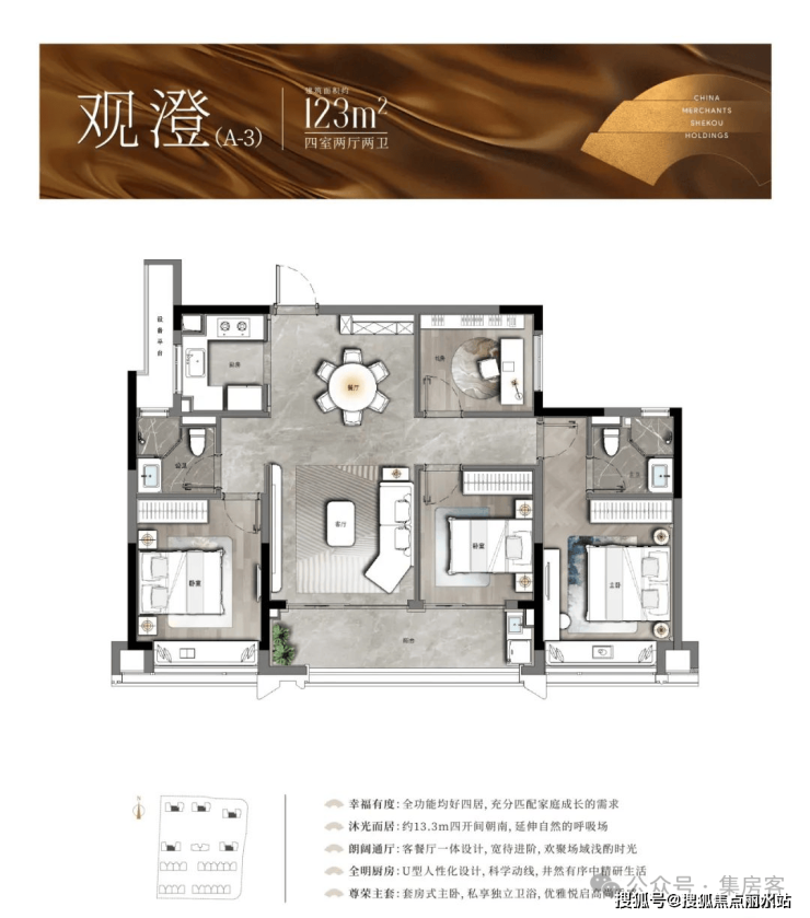 以中间套为例,建面约123㎡的户型做到了主次卧+客厅四开间朝南,伸展开约13.3米的超大面宽,对应双开间阳台与飘窗的设计,进一步提升了全屋的采光。此外,一体化的餐客厅,“一镜到底”活动空间,在视觉上拉大了户型的朗阔尺度。