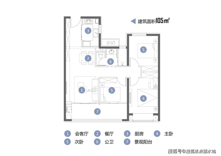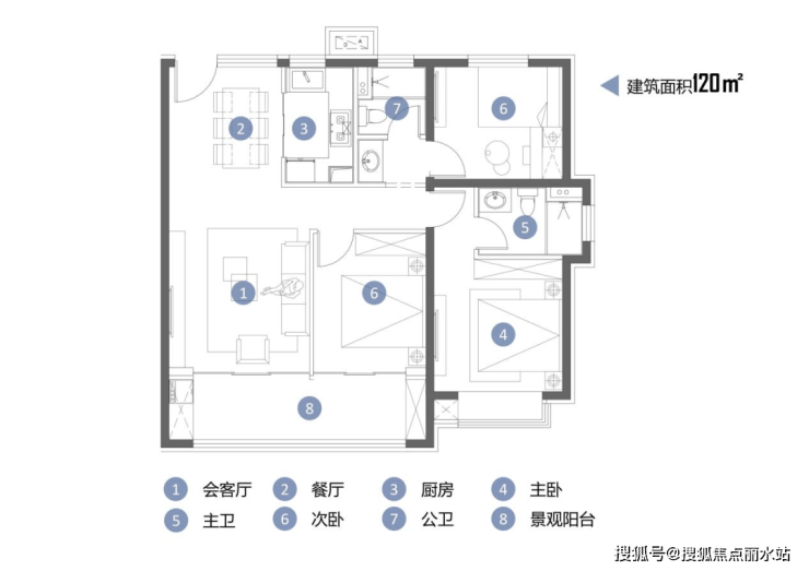 120户型则在此基础上进一步升级,通过入户花园增加入户仪式感,大面宽的客厅设计为家庭活动与休闲会客提供了更大气的空间,南向两开间通阔大阳台满足住户的个性化休憩、养生等多种场景需求。