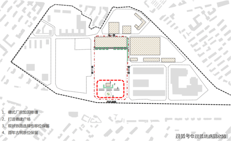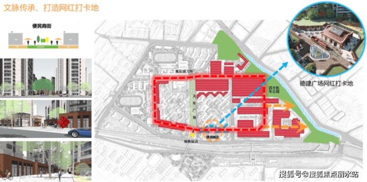 设计初期,充分考虑了赓续项目历史文脉和留住城市记忆的双重性,用地南侧结合老厂特色工业元素及前场两棵百年古树,集中打造与城市共享的文化广场,延续历史工业记忆,形成项目亮点。保留的德式小楼,打造成德建广场网红打卡地,同时向东西方向延伸打通天车广场、科创产业集群、四方机车公园的商业文化轴。