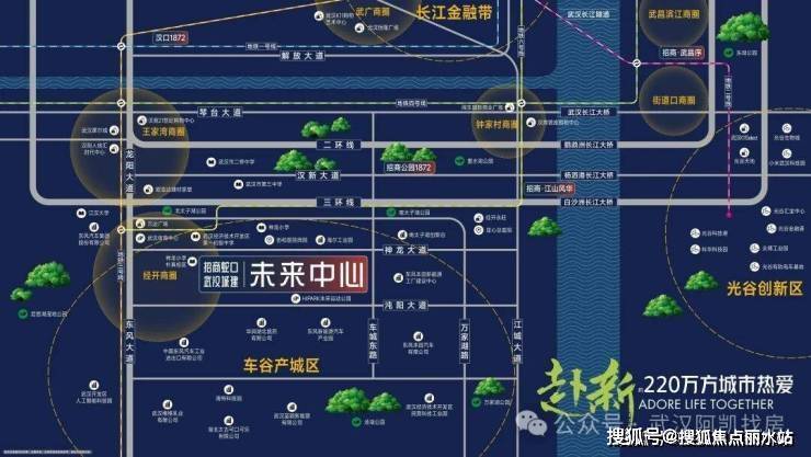 招商·武汉城建未来中心,由央企招商蛇口与国企武汉城建联袂巨献,布局武汉经开腹地,以柔性城市、幸福社区、热爱邻里三大核心理念,打造集居住、教育、商业、医疗、商办等于一体的220 万方未来幸福生活样板 ,为城市更好的未来而来。