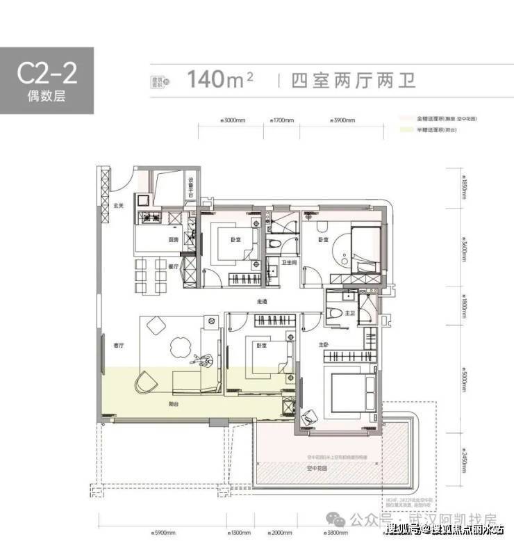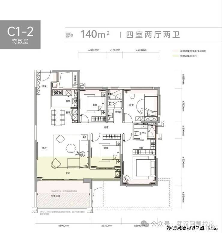 C2揽境在售建筑面积约107-140㎡三室、四室户型。