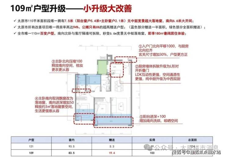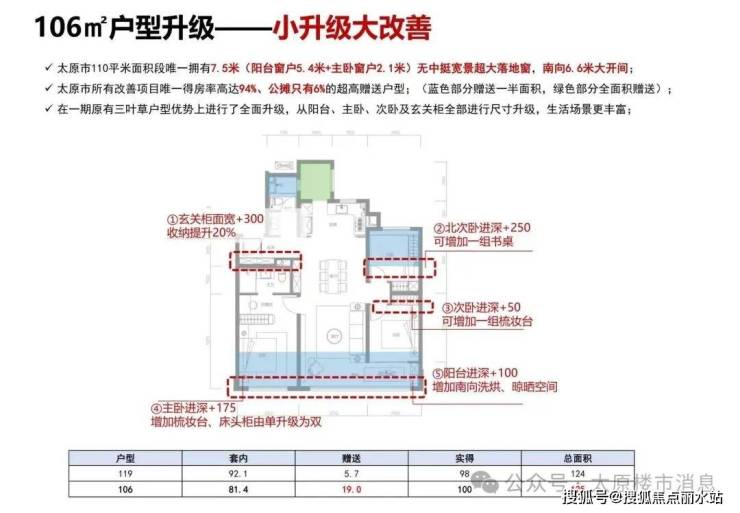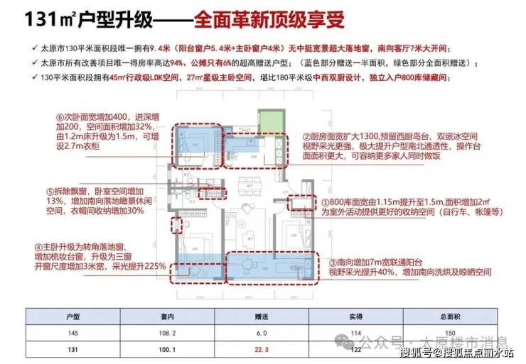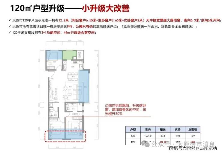 太原市所有改善项目唯一得房率高达94%、公摊只有6%的超高赠送户型;(蓝色部分赠送一半面积,绿色部分全面积赠送);