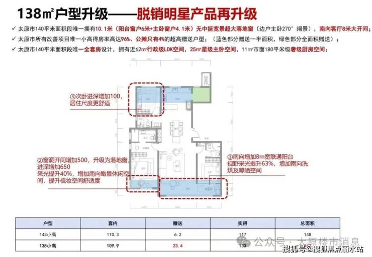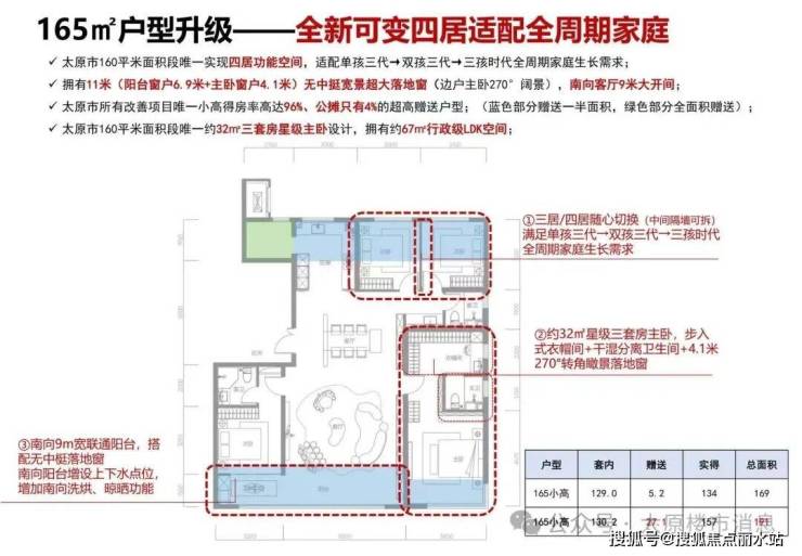 太原市所有改善项目唯一小高得房率高达96%、公摊只有4%的超高赠送户型;(蓝色部分赠送一半面积,绿色部分全面积赠送);