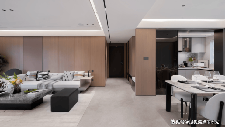 站在客厅沙发处,目光掠过横厅、大幅南向窗户、一体化餐厨区,明阔感像180平的大宅。