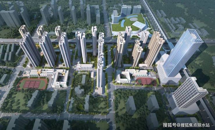 包括大比例的公共绿地、口袋公园,自带约11万方商业和社区商街,也囊括了从幼儿园到初中的12年教育硬件,以及高约200米的地标写字楼。是一个具备内生驱动力的成熟型超大社区。
