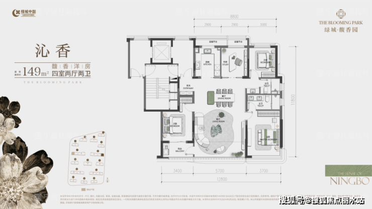总建筑面积约10万方,容积率仅2.2,规划有10幢洋房与5幢高层,主力户型为建面155 - 259㎡的精装大平层,定位为“全洋房 + 全改善”,树立了宁波高端人居新标杆。
