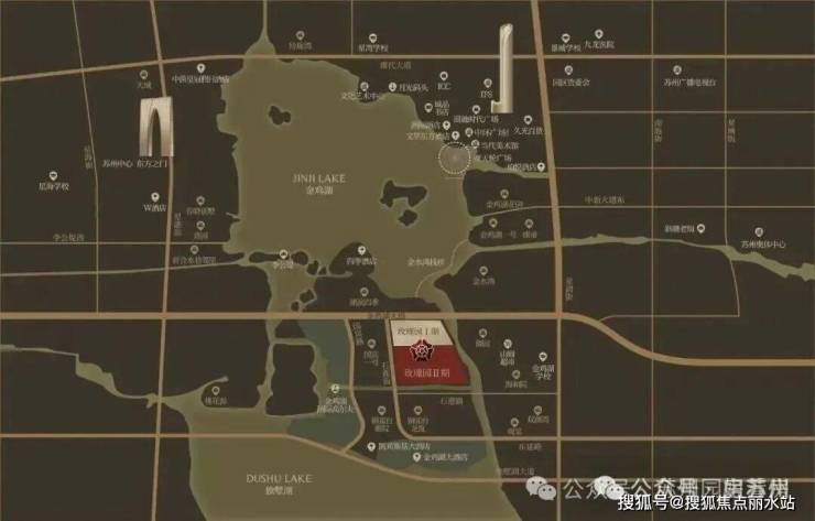 北侧直面金鸡湖,南侧近邻独墅湖,出门即地铁5号线,周边不乏国宾一号、铜雀台等10万+豪宅,圈层属性全市数一数二。