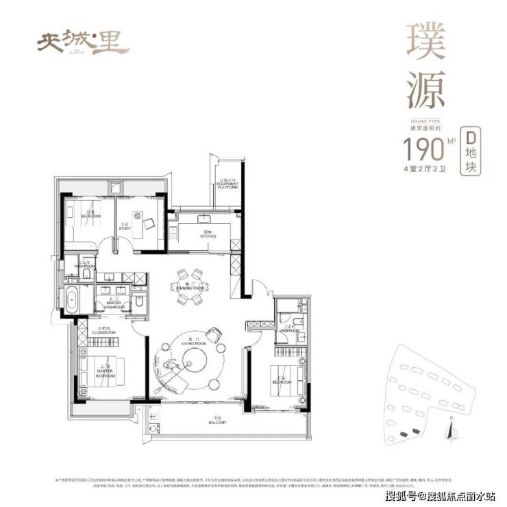190㎡(四房两厅三卫)户型采用LDKB一体化设计,6米大横厅串联独立餐厅,配博世厨电五件套、铂浪高花岗岩水槽及双嵌入式冰箱,中西双厨自由切换。南向次卧套房+主卧奢适套房,配备唯宝智能马桶、高仪恒温花洒及嵌入式浴缸。超大面宽阳台衔接景观,演绎主城芯国际生活范本。