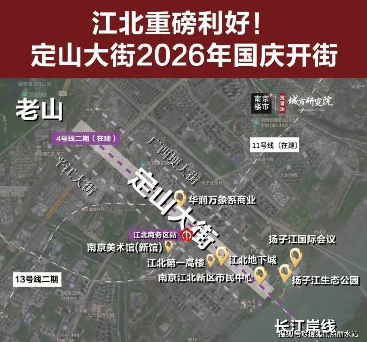 这条定山大街汇集诸多江北地标,包括江北地下城、江北第一高楼、华润万象系商业、地铁4号线二期与11号线交汇站点等,其中: