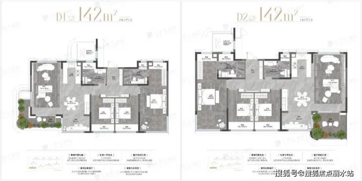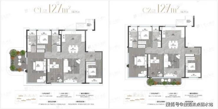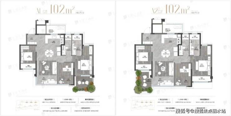 项目有多种户型,102平米三房户型起步,户户有露台,空间利用率超100%。