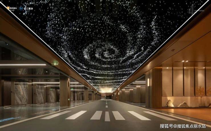 车库以豪装标准革新空间体验:约三万颗灯光编织成星云穹顶,车位顶部饰以黑色镜面不锈钢,低调中映衬奢华。首次将室内精装手法运用于地库,橘皮环氧车道与光面环氧车位分区铺陈,兼顾质感与实用。