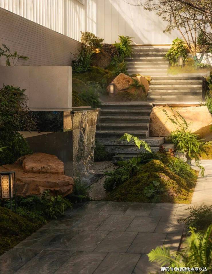 南侧庭院叠水潺潺作响,山、石、水、林错落交织,步步成趣,处处藏景。