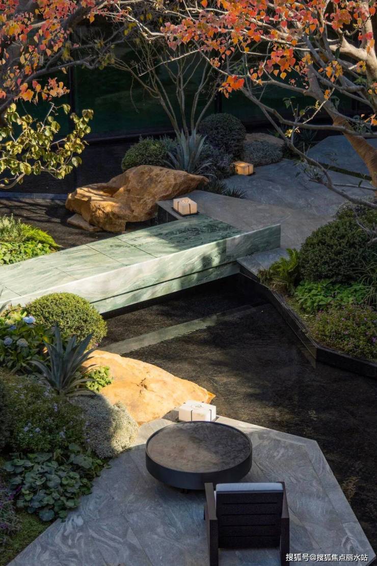 贝金米黄与孔雀玉石材铺就的景墙,尽显温润格调,与流动的水景交相辉映。