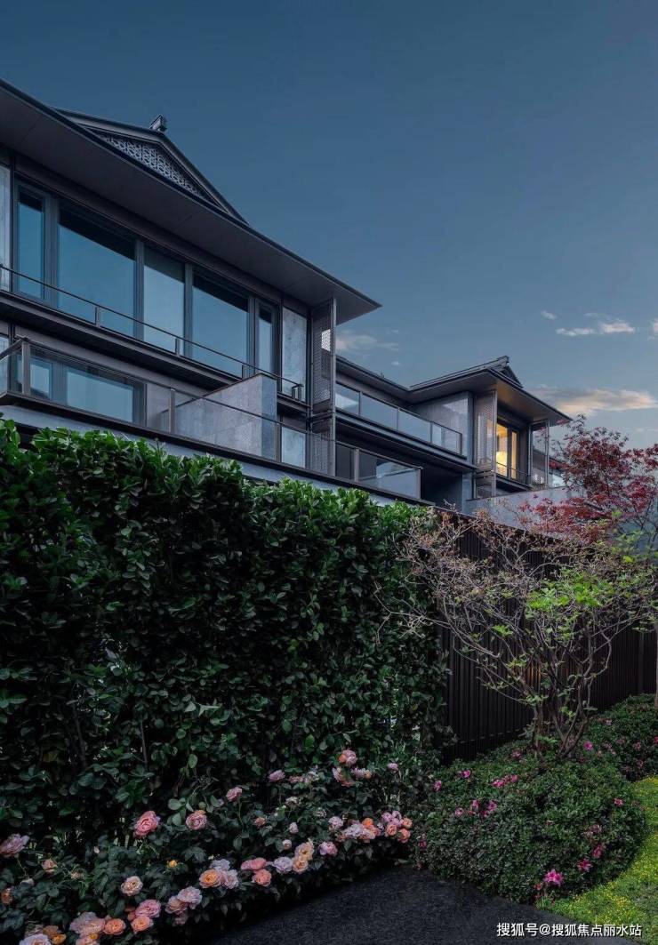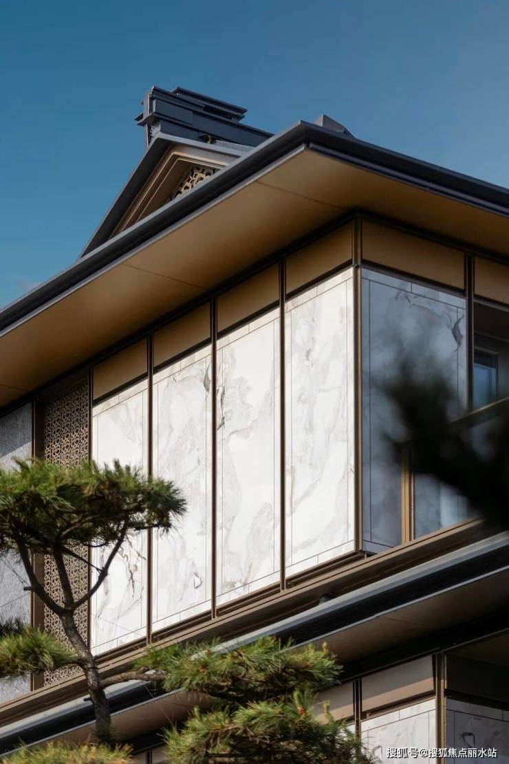 立面设计上,项目精选印度宝蓝石材、白玉岩板装饰屏面等高定材料,借由宋式歇山顶、寻杖栏杆等细节融入中国古典雅韵,让逸庐成为“可触摸的东方诗篇”。