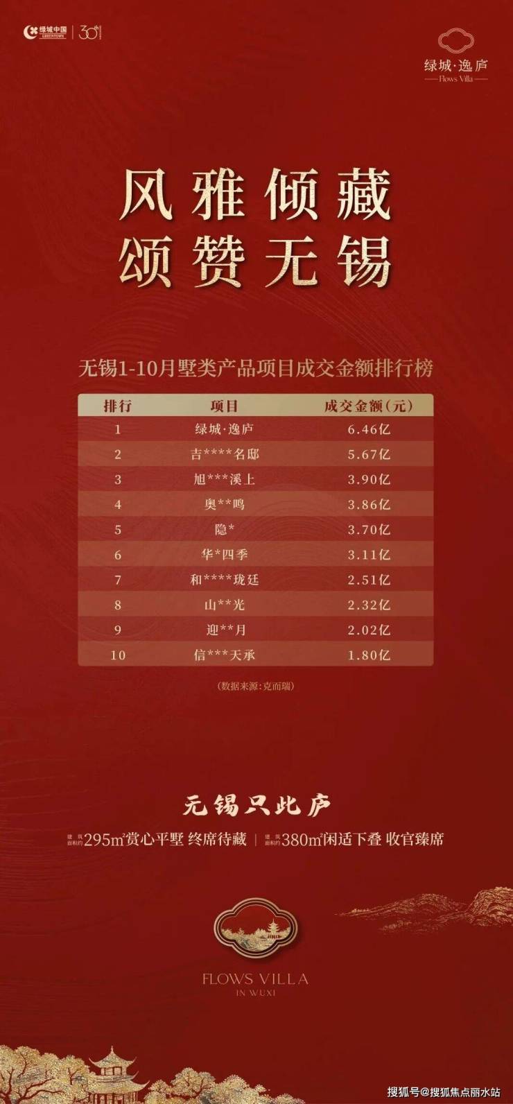 逸庐以网签6.46亿的傲人成绩,荣登“2025年1-10月无锡墅类产品成交金额排行榜”第一(数据来源:克而瑞)。
