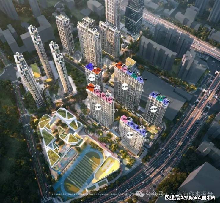 该项目总共14栋住宅、1栋写字楼、1所九年一贯制学校、1所幼儿园。11栋超高层。一期共5栋楼,1栋高层和4栋超高层,户均165㎡,定位改善。面积段为130-225㎡所有楼栋均在1F或与商业顶层间设置架空层。整体成围合式布局,中间成中央景观,前后楼间距55.6米。这个间距来说不算很大。又有是超高层和高层结合。相比现代第四代住宅和低密的项目还是有点“刚”的。